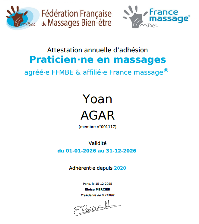 Praticien en massages bien-être, agréé FFMBE (Fédération Française de Massages-bien-être) et certifié en 2020 par le centre de formation Temana (Colomiers).